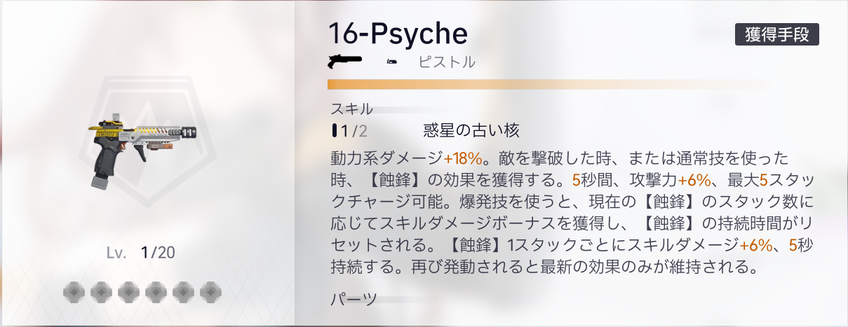 動力系ダメージ+30%。敵を撃破した時、または通常技を使った時、【蝕鋒】の効果を獲得する。5秒間、攻撃カ+10%、最大5スタックチャージ可能。爆発技を使うと、現在の【蝕鋒】のスタック数に応じてスキルダメージボーナスを獲得し、【蝕鋒】の持続時間がリセットされる。【蝕鋒】1スタックごとにスキルダメージ+10%、5秒持続する。再び発動されると最新の効果のみが維持される。
