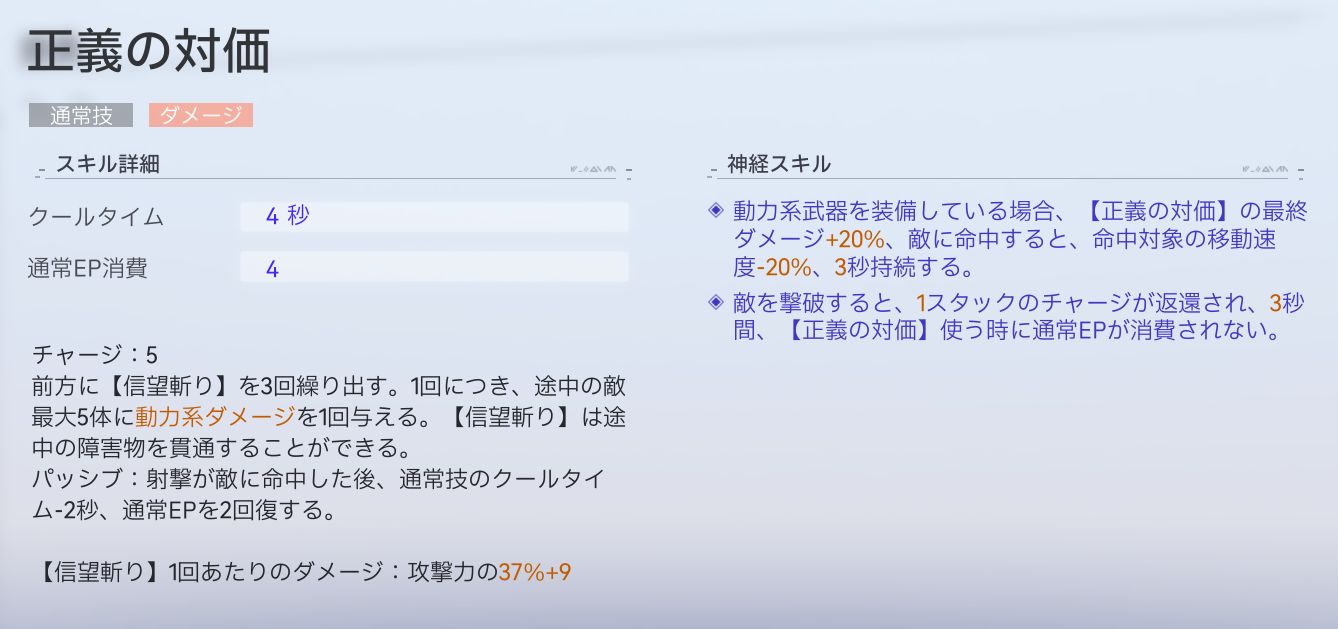 射撃が敵に命中するごとに通常技のクールタイム減少し、通常EPが回復するため、回転率に優れたスキルとなっています。