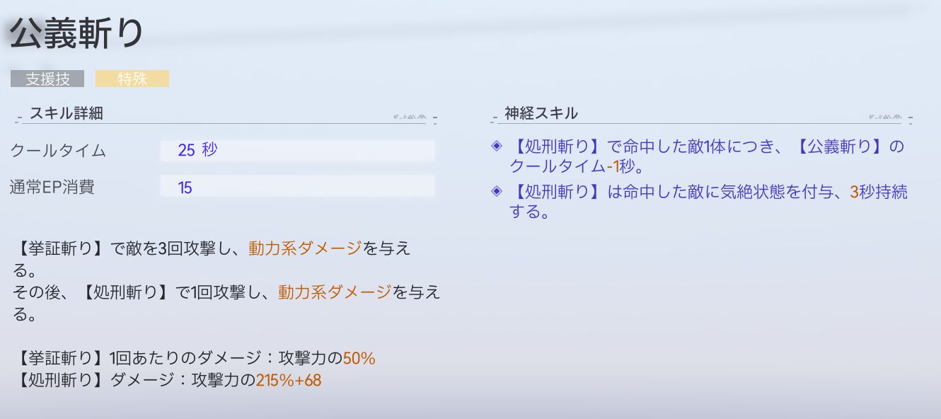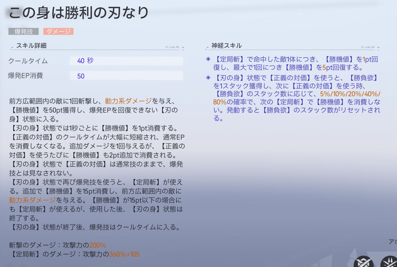 正義追撃【刃の身】状態で、敵の現在HPが低いほど与ダメージが高くなる。最大30%までアップできる
