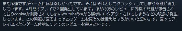 懸念点は、体験版やった限りだと探索がワクワクしなかったところ。ボス戦がおもしろかったら別にいいんだけども、ボスの数も図鑑を見た感じそんなに多くなかった。あくまで体験版の話だけども。