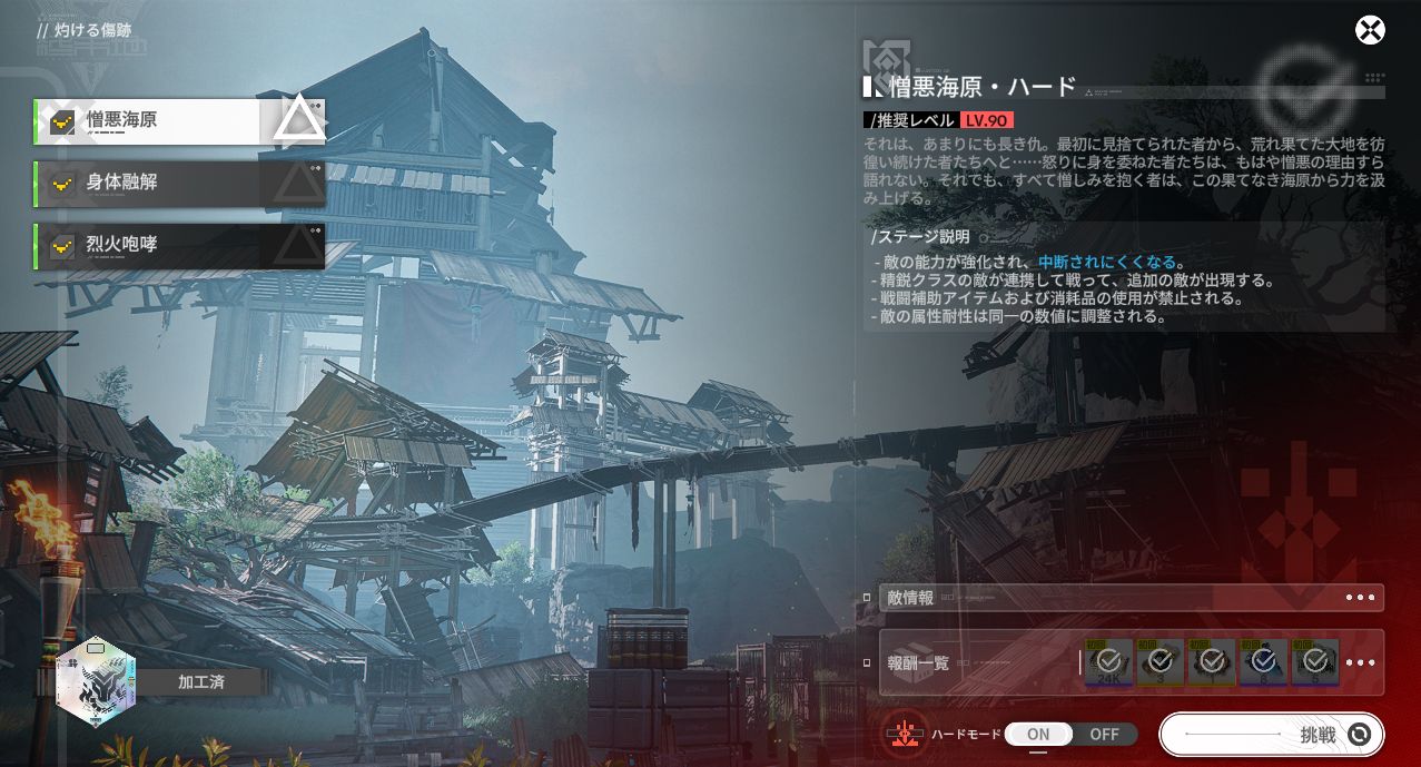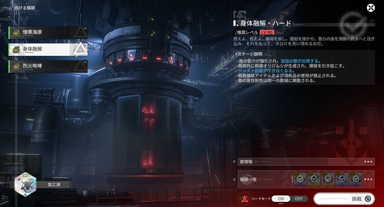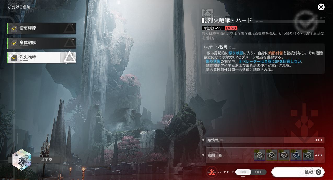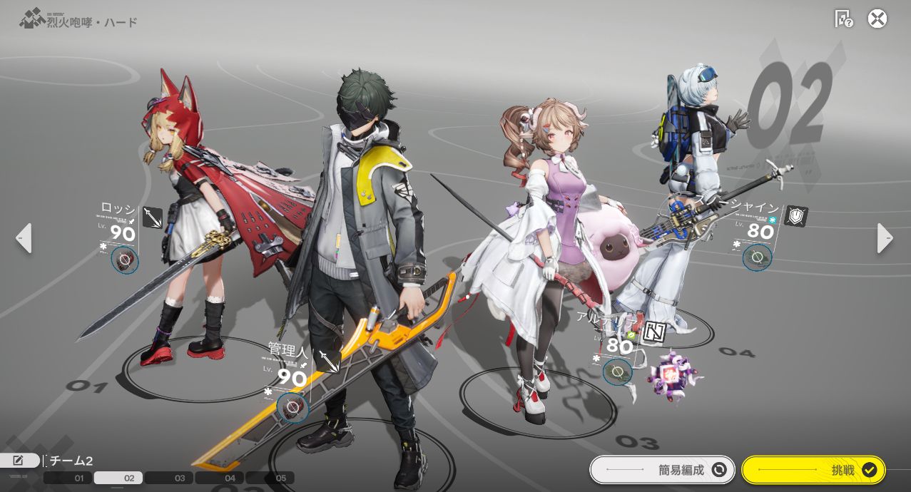 ロッシの戦技のみ使用して敵を転ばせ続けると無力化できるので楽でした。ロッシの代わりにチェンを入れてもいけるはず。スノーシャインの凍結も有効。敵の行動を阻害しないとダメージエリアが生成されて近付けなくなります。