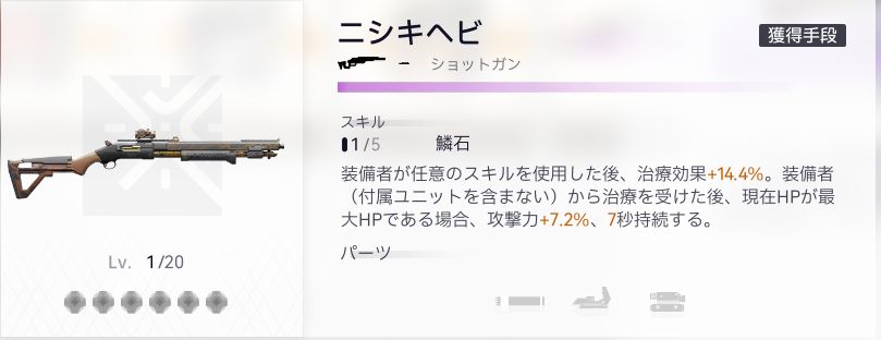 | 捕食時期 | 動力系武器を装備した場合、戦闘補正前攻撃力に基づいて【越冬の爪跡】を2つ直接獲得する。チャージMAXの【越冬の爪跡】の数が2以下の場合、時間とともに減少しない。 |