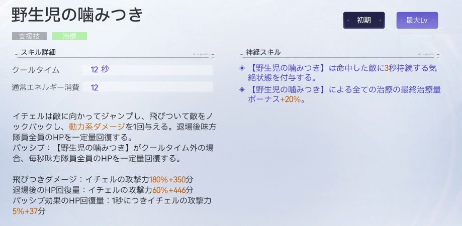 | HP回復倍率 | イチェルの攻撃力60%+446 パッシブ:イチェルの攻撃力5%+37 |
