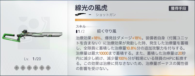治療効果+30%、爆発技ダメージ+30%。装備者自身(付属ユニットを含まない)に治療効果が発動した時、発生した治療量を蓄積し、全隊員に蓄積した治療量18%分の追加攻撃力を付与する。治療量は最大10000まで蓄積する。また、蓄積した治療量は20秒内に減少し続け、減少量100%分が戦場にいる隊員のHPに転換する。この効果は治療に見なさないため、治療量ボーナスの属性値の影響を受けない。