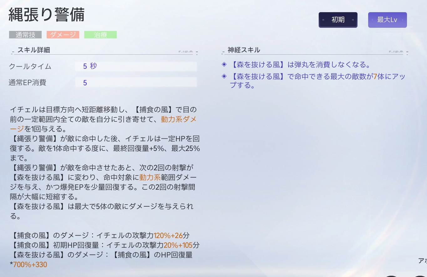 | ダメージ倍率 | 【捕食の風】:イチェルの攻撃力120%+26 【森を抜ける風】:【捕食の風】のHP回復量*700%+330 |