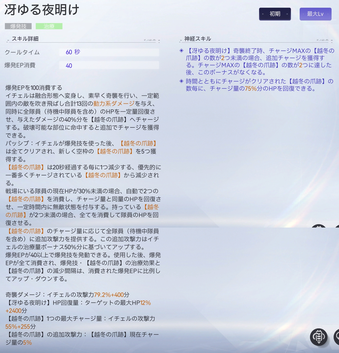 爆発技で与えたダメージの40%分が【越冬の爪跡】としてチャージされ、チャージ量に応じて全隊員の攻撃力が上昇しますが、爆発技のダメージ量と【越冬の爪跡】の最大チャージ量はイチェルの攻撃力に依存するのに対して、追加攻撃力バフはイチェルの治療量ボーナスに応じて上昇していきます。