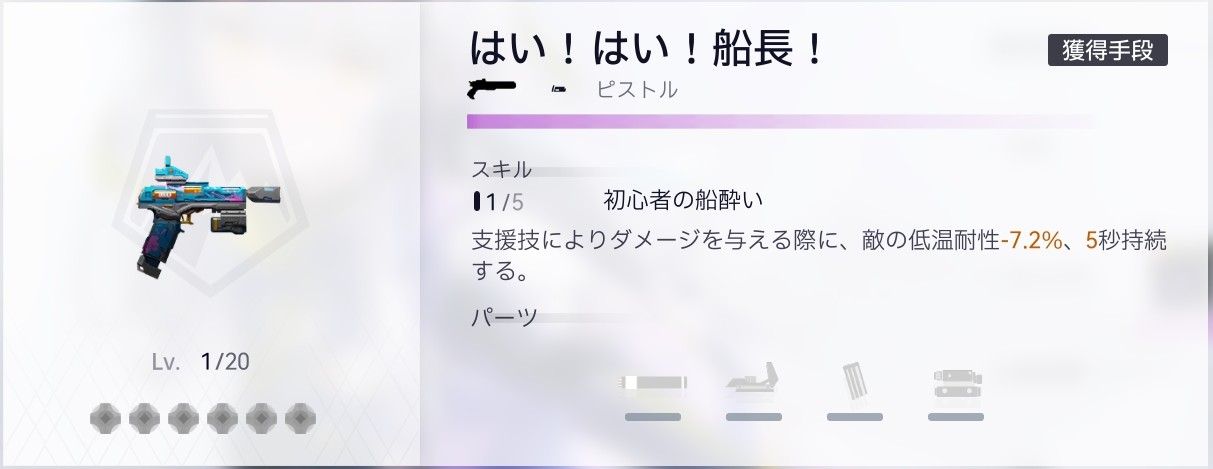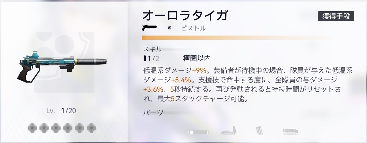 低温系ダメージ+15%。装備者が待機中の場合、隊員が与えた低温系ダメージ+9%。支援技で命中する度に、全隊員の与ダメージ+6%、5秒持続する。再び発動されると持続時間がリセットされ、最大5スタックチャージ可能。
