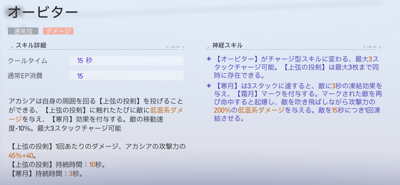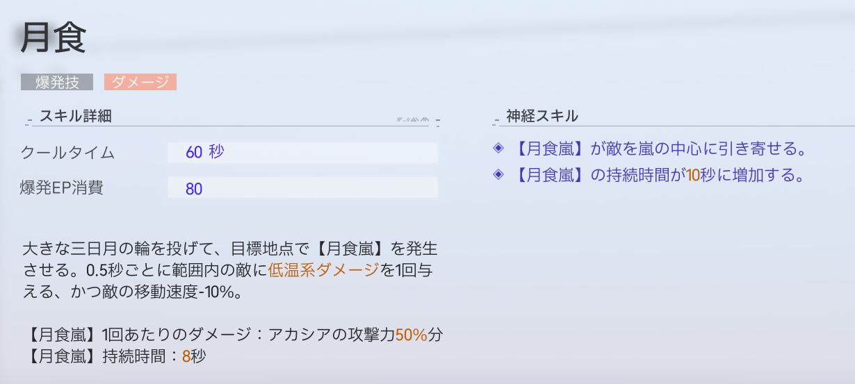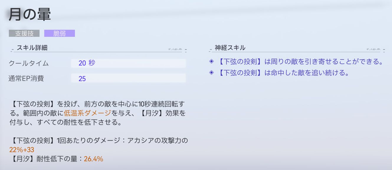 アカシア(装備者)が待機しているだけで低温系ダメージが上昇し、支援技を使用すると与ダメージが上昇します。