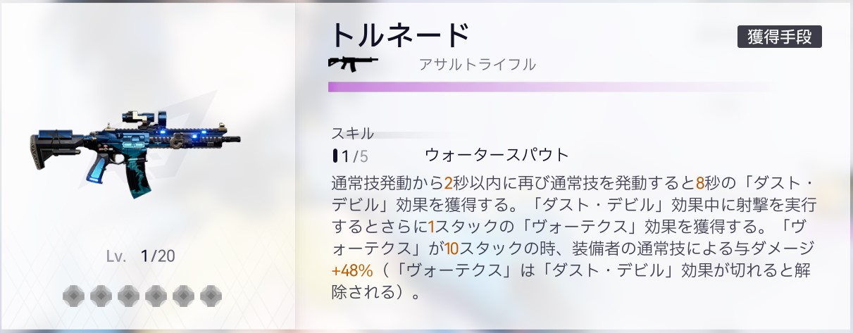 | SSR武器 | 通常技を2秒以内に連続で使用すると通常技による与ダメージ+24%。その後、射撃5発 or 爆発技1発で撃つと通常技による被ダメージデバフ+30%(8秒) |