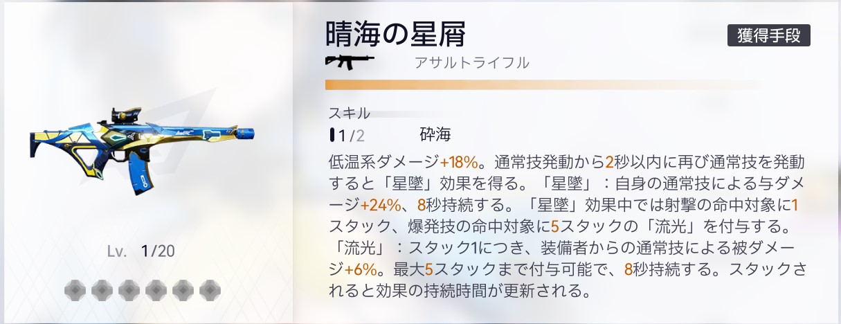 低温系ダメージ+30%。通常技発動から2秒以内に再び通常技を発動すると「星墜」効果を得る。「星墜」:自身の通常技による与ダメージ+40%、8秒持続する。「星墜」効果中では射撃の命中対象に1スタック、爆発技の命中対象に5スタックの「流光」を付与する。「流光」:スタック1につき、装備者からの通常技による被ダメージ+10%。最大5スタックまで付与可能で、8秒持続する。スタックされると効果の持続時間が更新される。
