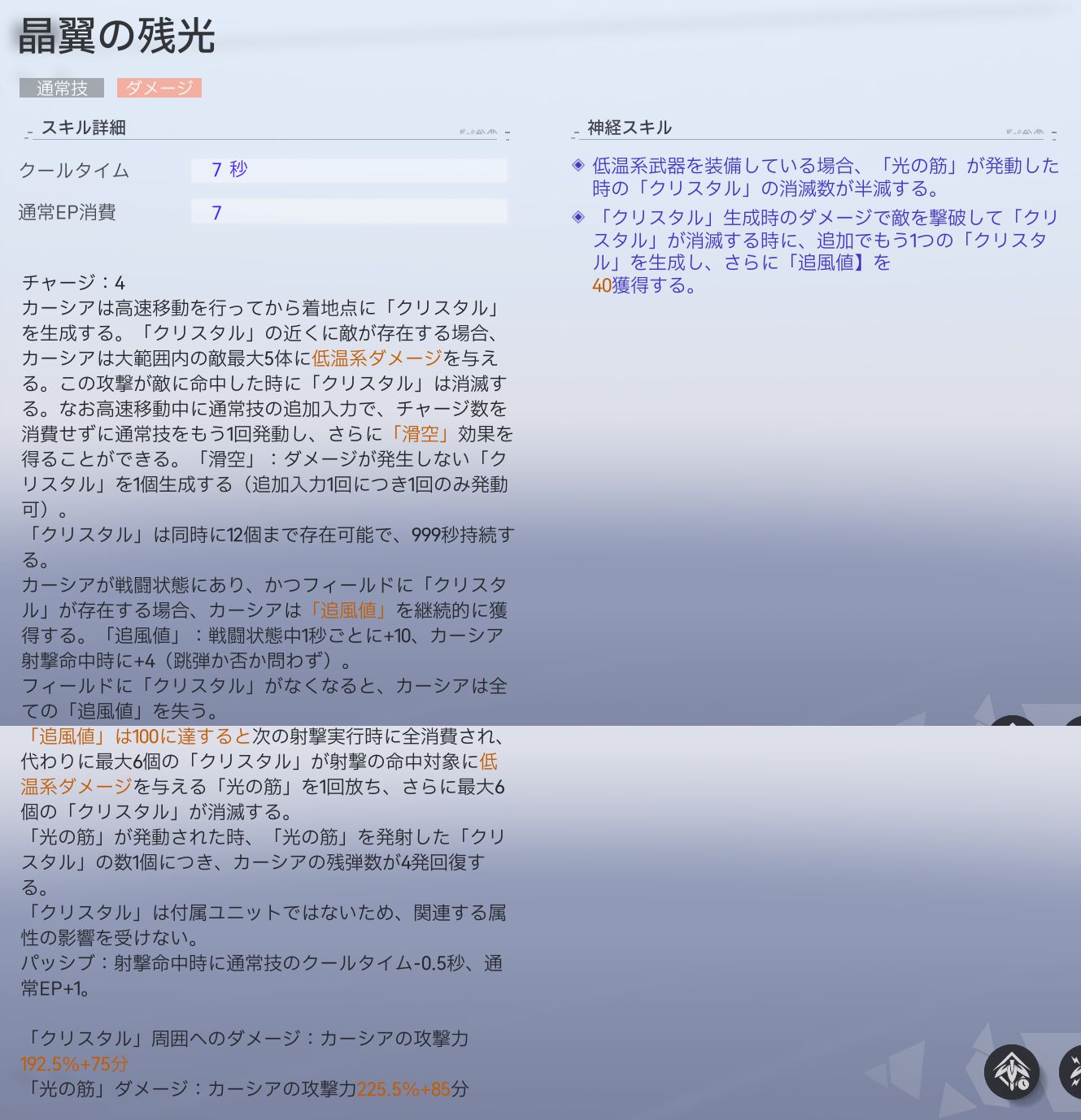 | ダメージ倍率 | クリスタル:カーシアの攻撃力192.5%+75 光の筋:カーシアの攻撃力225.5%+85 |