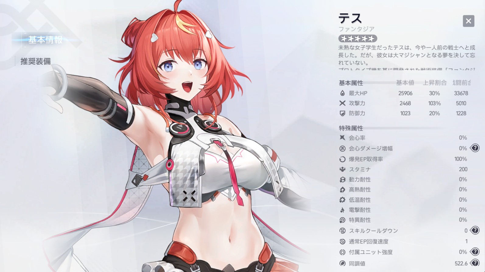 お試しステージのテス-ファンタジアは「攻撃力」+「同調値」+「低温系ダメージ」です。