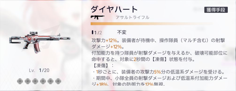 ・期間中、小隊全員の射撃ダメージおよび低温系付加能力ダメージ+30%、対象の防御力を20%無視。