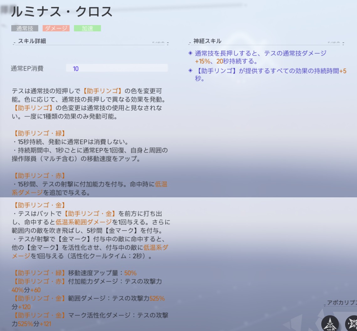 | ダメージ | 赤:低温系ダメージ(テスの攻撃力40%+60)を追加で与える |
