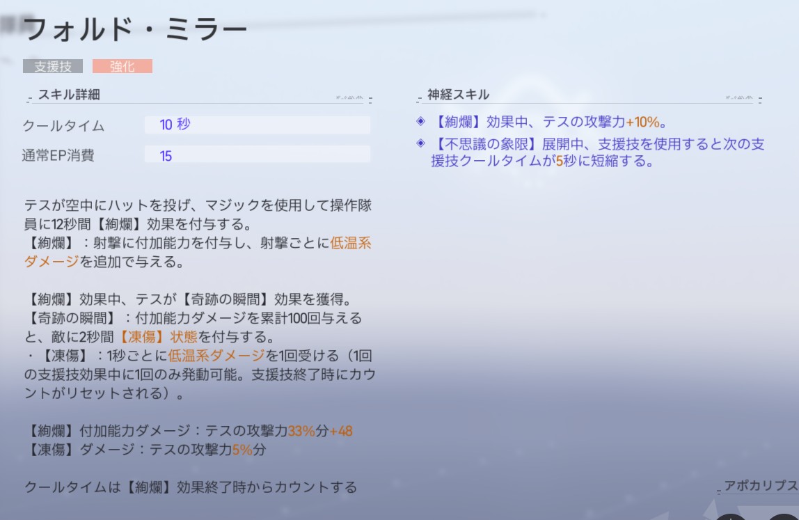 | 錯覚の最上級 | 支援技【フォルド・ミラー】Lv+1 【絢爛】による付加能力ダメージがテスの攻撃力33%分+48にアップする |