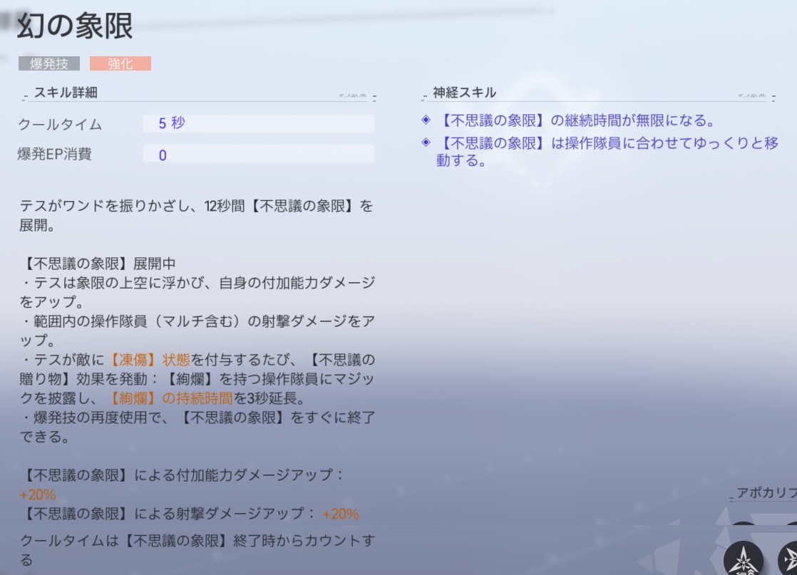 【不思議の象限】展開中、テスと象限内の隊員(マルチ含む)の攻撃力+35%。