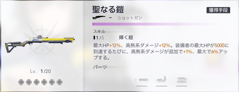 | 聖なる鎧 (紫武器) | 装備者の最大HPが5000に到達するたびに、高熱系ダメージが追加で+1% |
