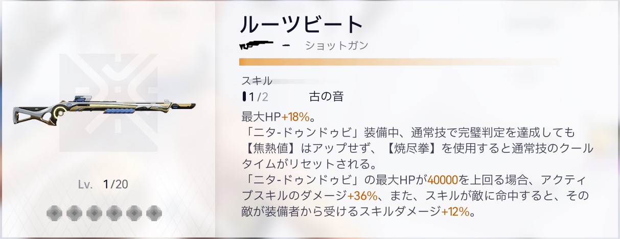 | ルーツビート (橙武器) | 「ニタ-ドゥンドゥビ」の最大HPが40000を上回る場合、アクティブスキルのダメージ+60% |