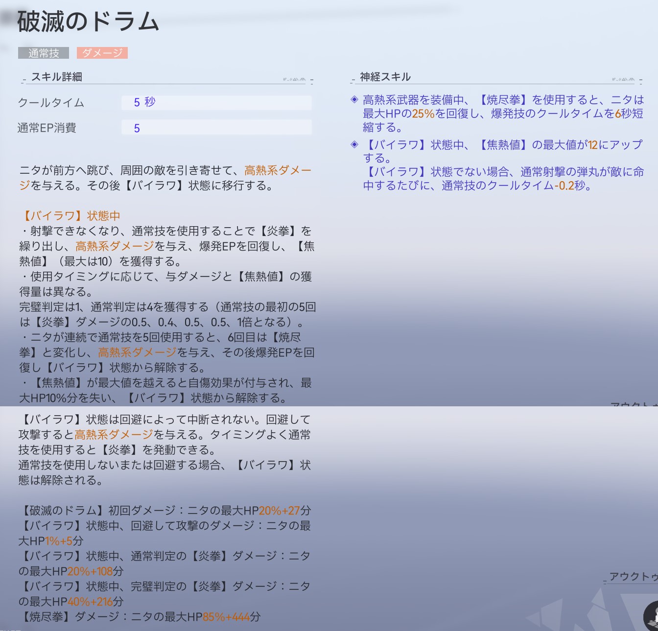 | ダメージ倍率 | 初回ダメージ:ニタの最大HP20%+27 【バイラワ】状態中、回避攻撃のダメージ:ニタの最大HP1%+5 【バイラワ】状態中、通常判定ダメージ:ニタの最大HP20%+108 【バイラワ】状態中、完璧判定ダメージ:ニタの最大HP40%+216 【焼尽拳】ダメージ:ニタの最大HP85%+444 |