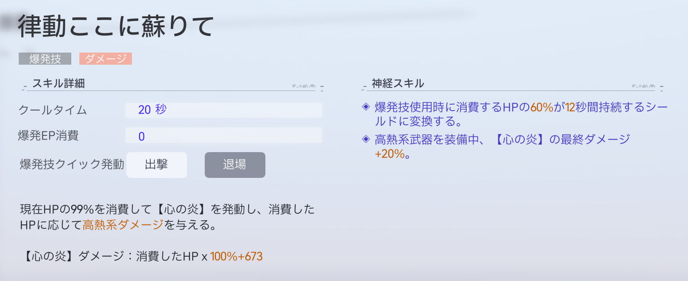 | 爆発EP消費 | 0(※現在HPの99%を消費する) |