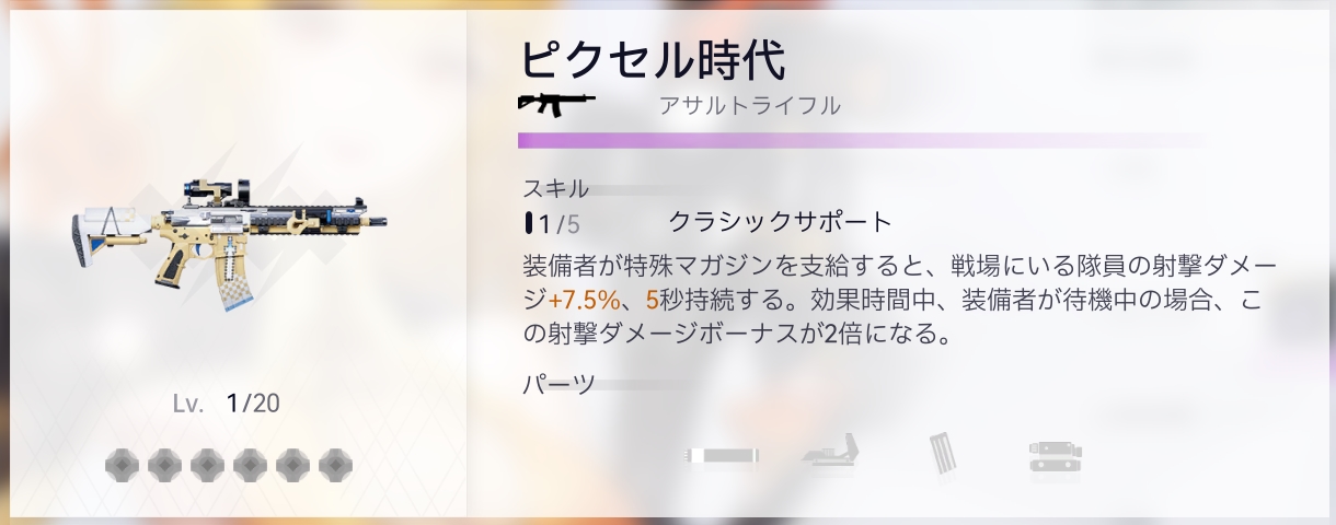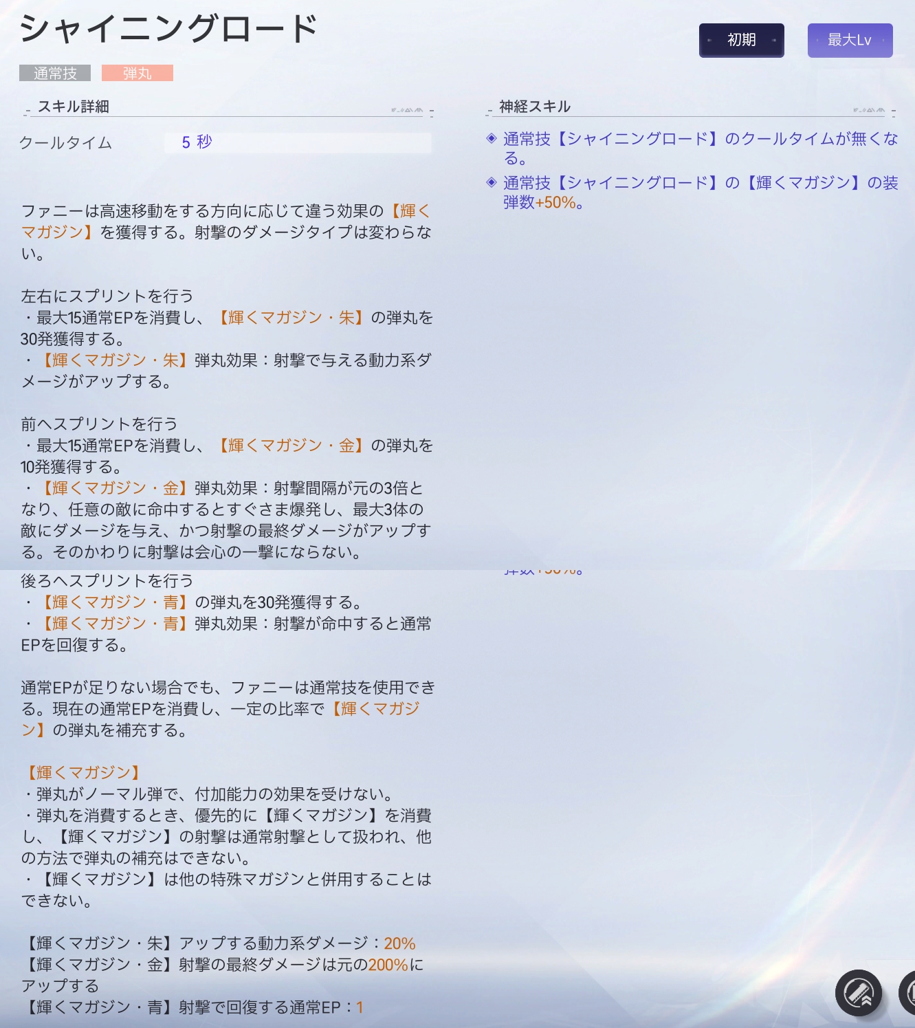| ダメージ倍率 | 【輝くマガジン・朱】:動力系ダメージ+20% 【輝くマガジン・金】:射撃の最終ダメージが元の200% |
