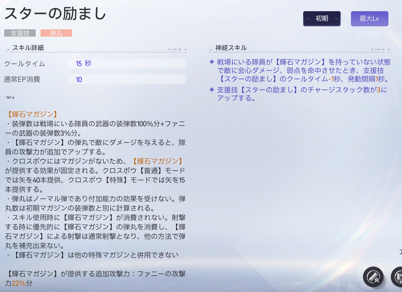 | 前 | ![]() | 通常EP15を消費して【輝くマガジン・金】を獲得 ・15発 ・射撃間隔が3倍 ・最大3体まで命中する範囲攻撃 ・射撃の最終ダメージが上昇 ・会心の一撃が発生しない |