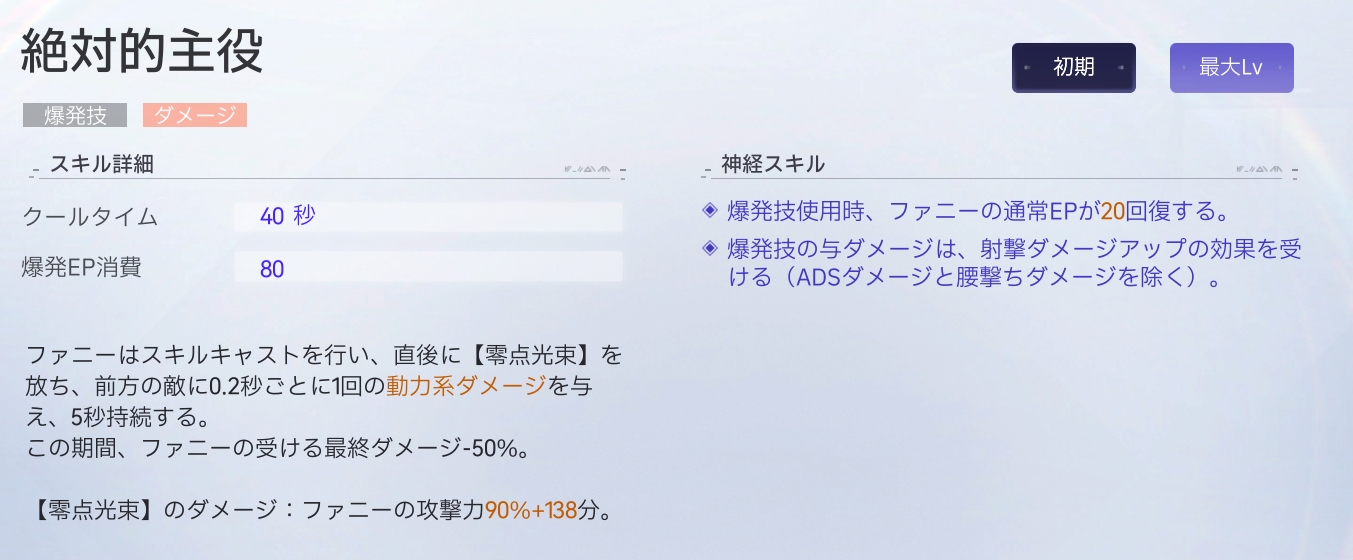 爆発技使用時に通常EPが20回復しますが、アタッカーとしてファニーを使う場合は通常EPが枯渇することはありません。