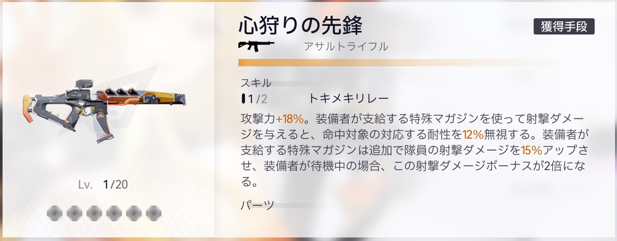 攻撃力+30%。装備者が支給する特殊マガジンを使って射撃ダメージを与えると、命中対象の対応する耐性を20%無視する。装備者が支給する特殊マガジンは追加で隊員の射撃ダメージを25%アップさせ、装備者が待機中の場合、この射撃ダメージボーナスが2倍になる