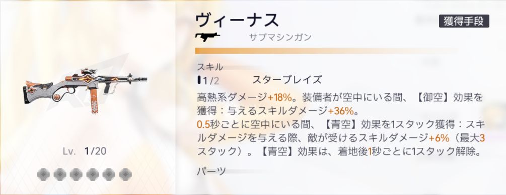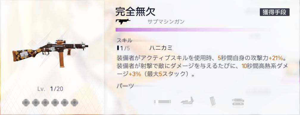 装備者が射撃で敵にダメージを与えるたびに、10秒間高熱系ダメージ+5%(最大5スタック)