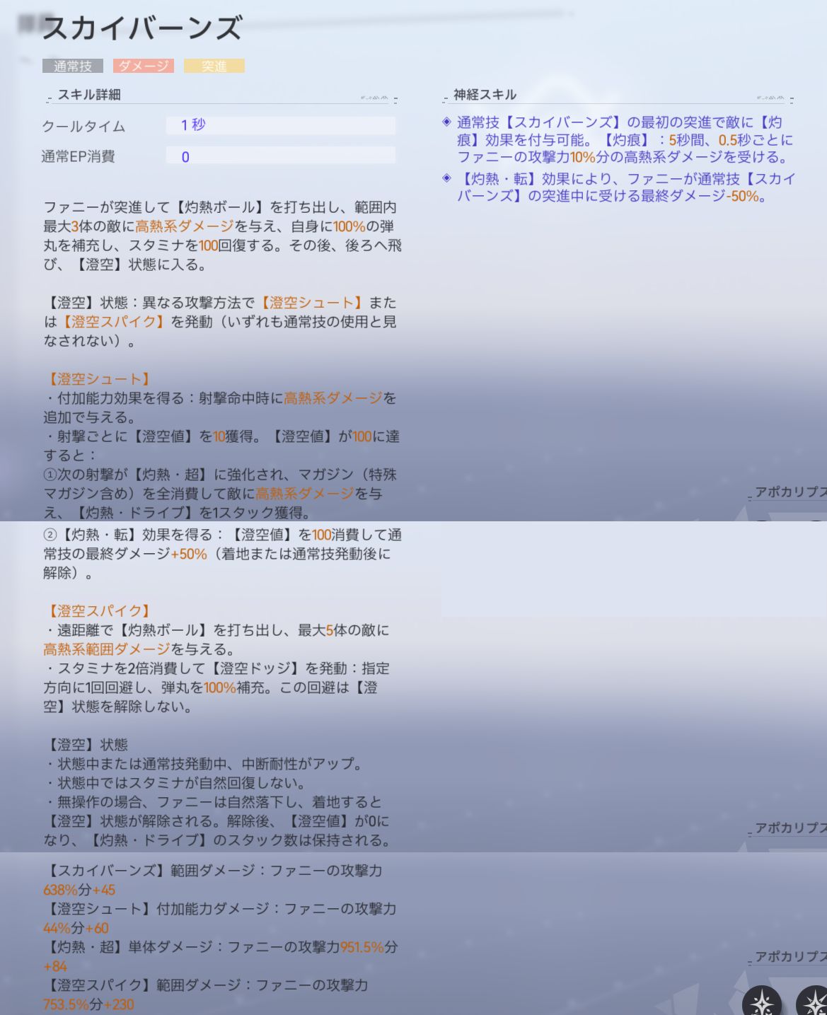 | ダメージ倍率 | 【スカイバーンズ】範囲ダメージ:ファニーの攻撃力580%+25 【澄空シュート】付加能力ダメージ:ファニーの攻撃力40%+40 【灼熱・超】単体ダメージ:ファニーの攻撃力865%+47 【澄空スパイク】範囲ダメージ:ファニーの攻撃力685%+87 |
