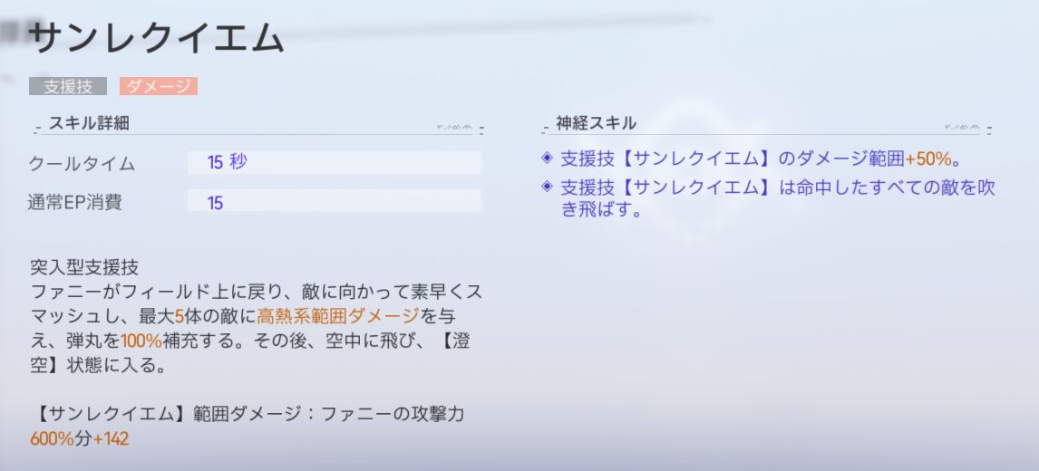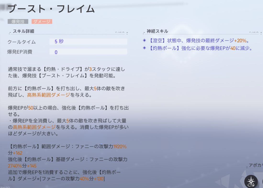 | ダメージ | 基本ダメージ:ファニーの攻撃力1920%+162 強化ダメージ:ファニーの攻撃力2740%+145 追加ダメージ:爆発EP1消費するごとにファニーの攻撃力40%+130 |