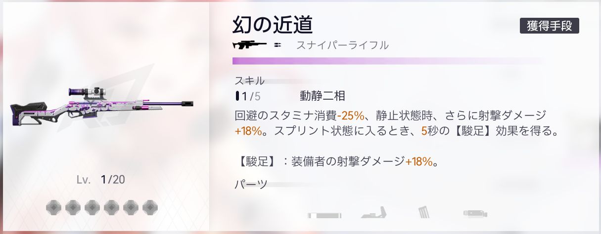 回避のスタミナ消費-25%、静止状態時、さらに射撃ダメージ+30%。スプリント状態に入るとき、5秒の【俊足】効果を得る。