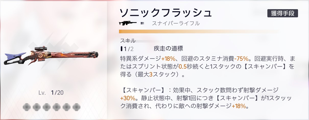 特異系ダメージ+30%、回避のスタミナ消費-75%。回避実行時、またはスプリント状態が0.5秒続くと1スタックの【スキャンパー】を得る(最大3スタック)