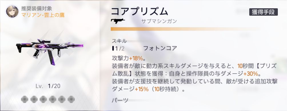 装備者が敵に動力系スキルダメージを与えると、10秒間【プリズム錯乱】状態を獲得:自身と操作隊員の与ダメージ+50%