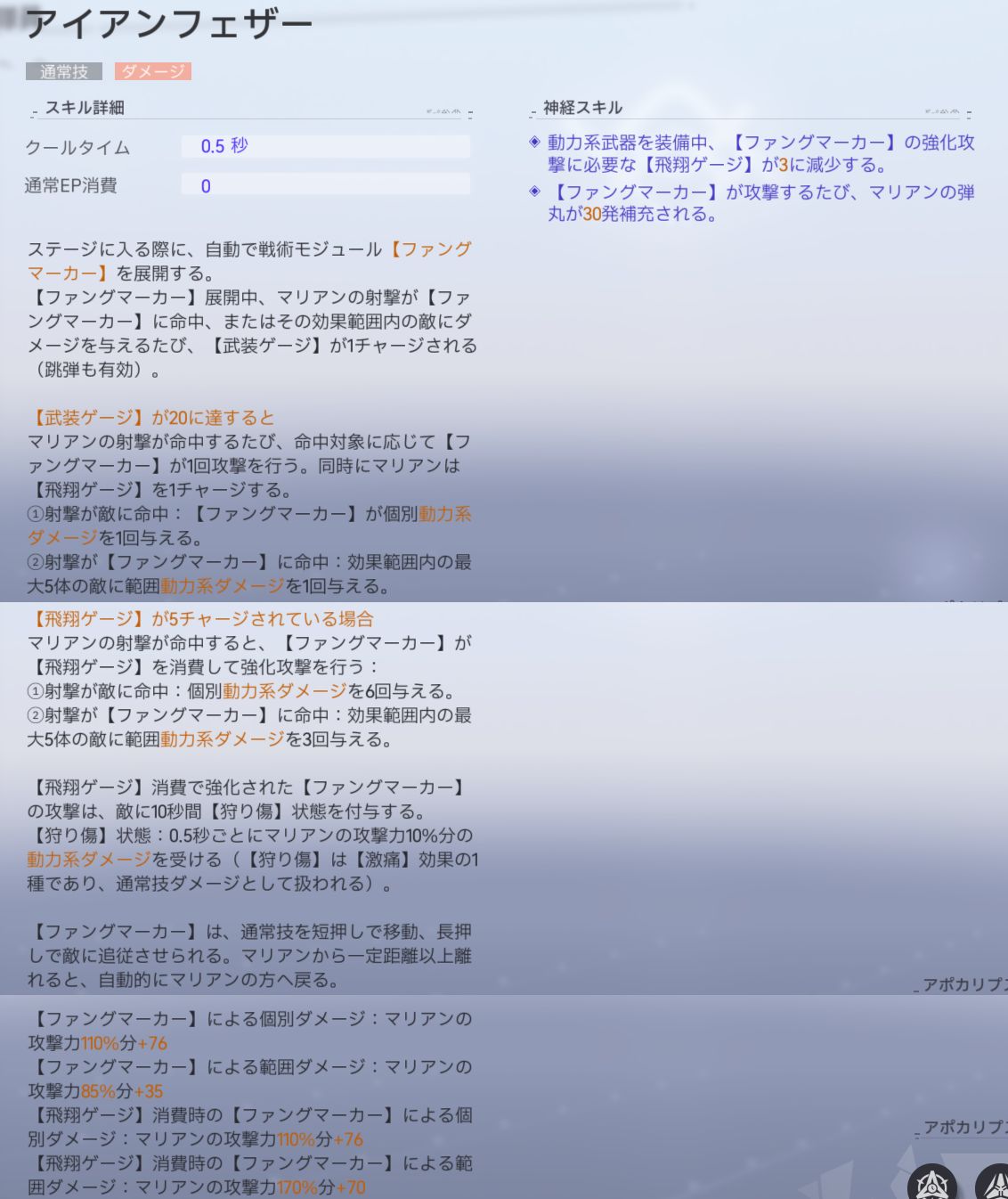 | ダメージ倍率 | 【ファングマーカー】単体ダメージ:マリアンの攻撃力110%+76 【ファングマーカー】範囲ダメージ:マリアンの攻撃力85%+35 【飛翔ゲージ+ファングマーカー】単体ダメージ:マリアンの攻撃力110%+76 【飛翔ゲージ+ファングマーカー】範囲ダメージ:マリアンの攻撃力170%+70 |