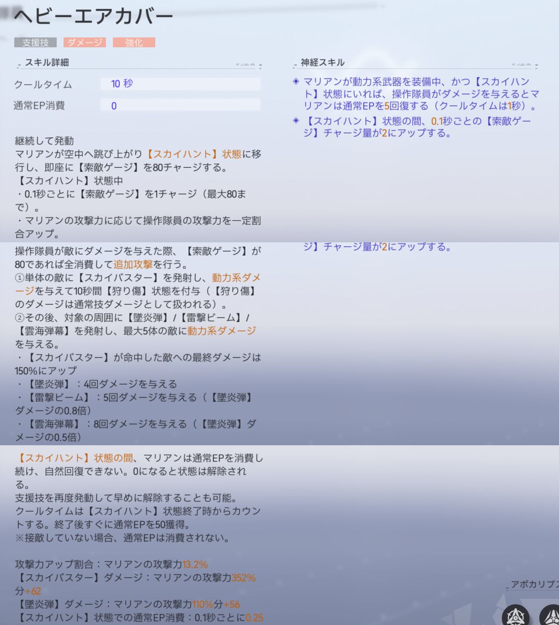 | 広域制圧 | 【スカイハント】状態の間、マリアンと操作隊員が敵に与えるダメージは、敵の全ダメージタイプ耐性を12%無視する |