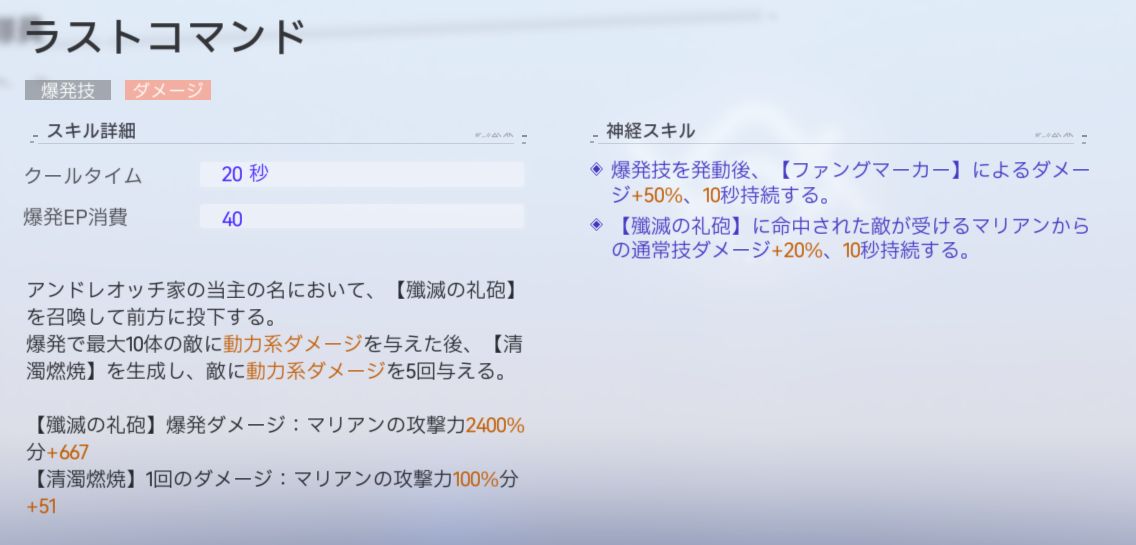 | ダメージ | 【殲滅の礼砲】ダメージ:マリアンの攻撃力2400%+667 【清濁燃焼】ダメージ:1回につきマリアンの攻撃力100%+51 |