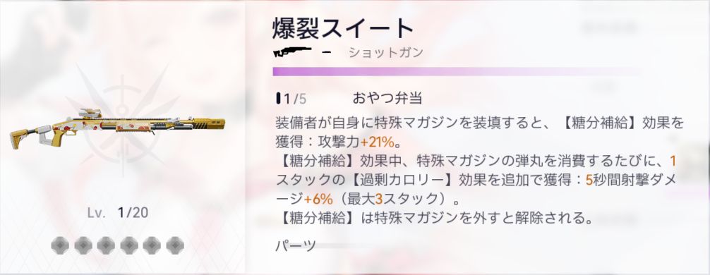【糖分補給】効果中、特殊マガジンの弾丸を消費するたびに、1スタックの【過剰カロリー】効果を追加で獲得:5秒間射撃ダメージ+10%(最大3スタック)