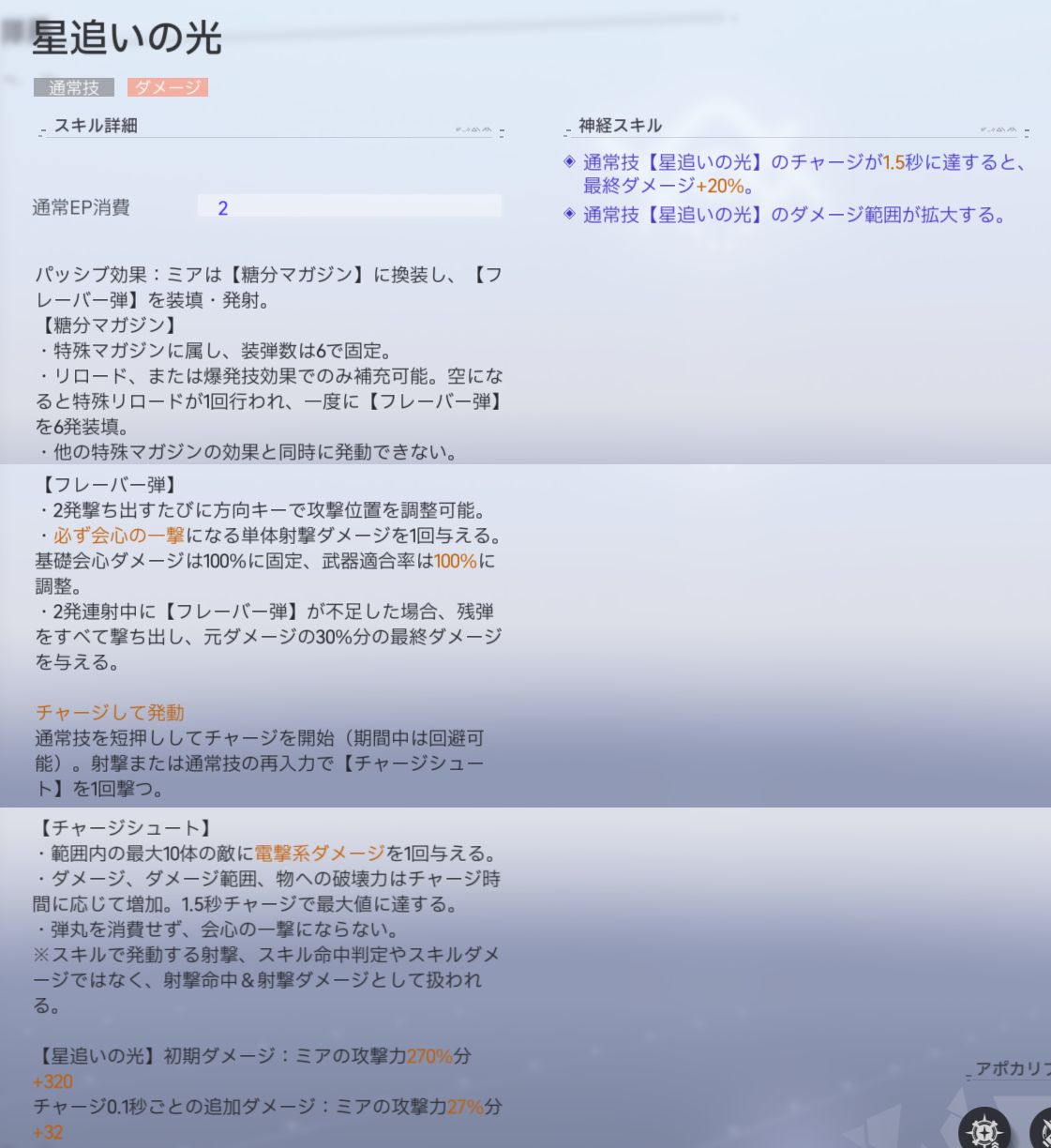 | ダメージ倍率 | ミアの攻撃力270%+320 【チャージシュート】0.1秒毎の追加ダメージ:ミアの攻撃力27%+32 |