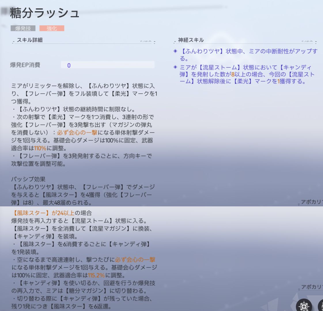 | 糖分ダブル | 特殊マガジンに換装時、ミアの与えるダメージは敵の電撃耐性を15%無視する |