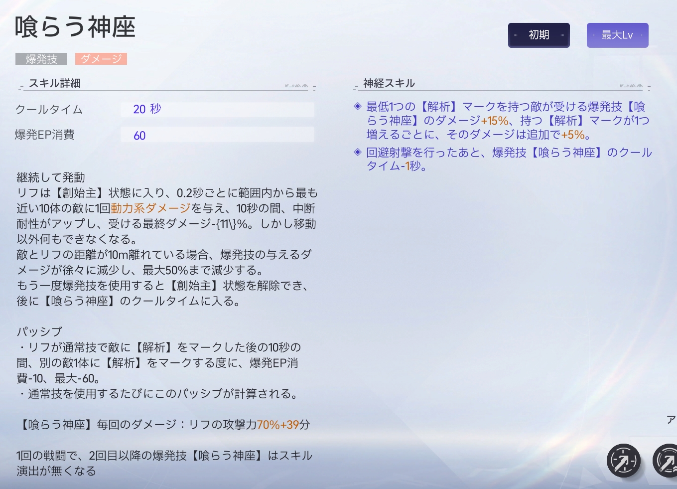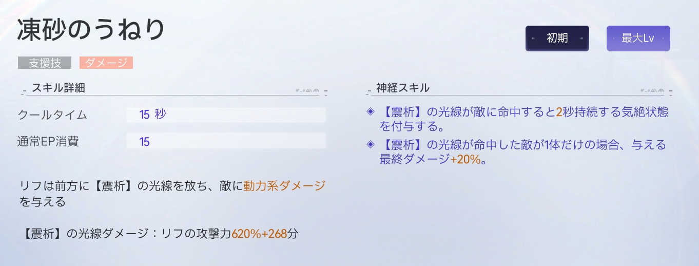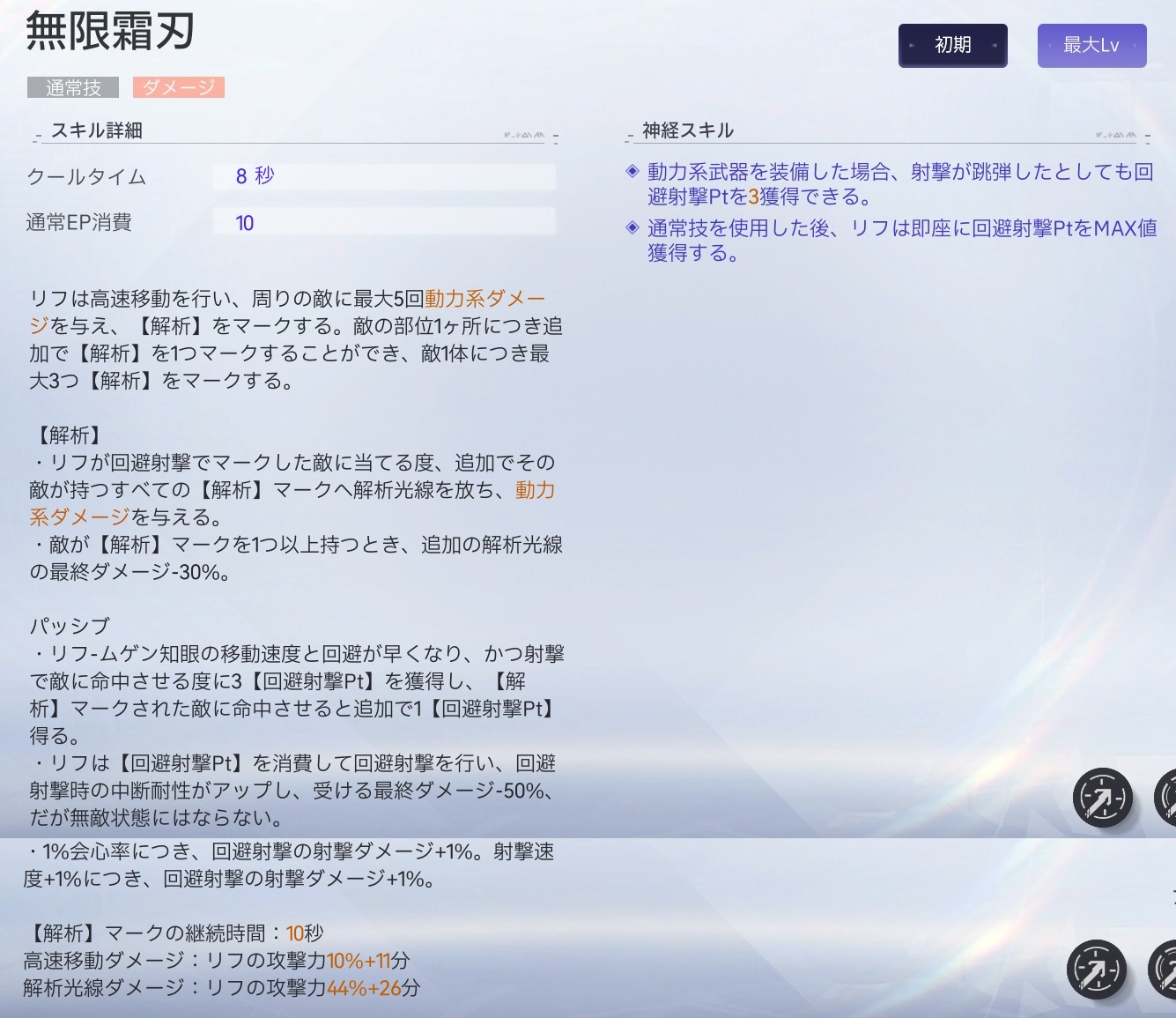 | ダメージ倍率 | 高速移動ダメージ:リフの攻撃力10%+11 解析光線ダメージ:リフの攻撃力44%+26 会心率1%につき、回避射撃のダメージ+1% 射撃速度+1%につき、回避射撃のダメージ+1% |
