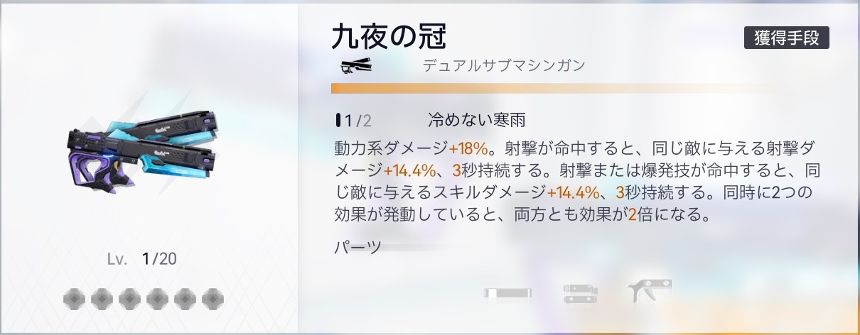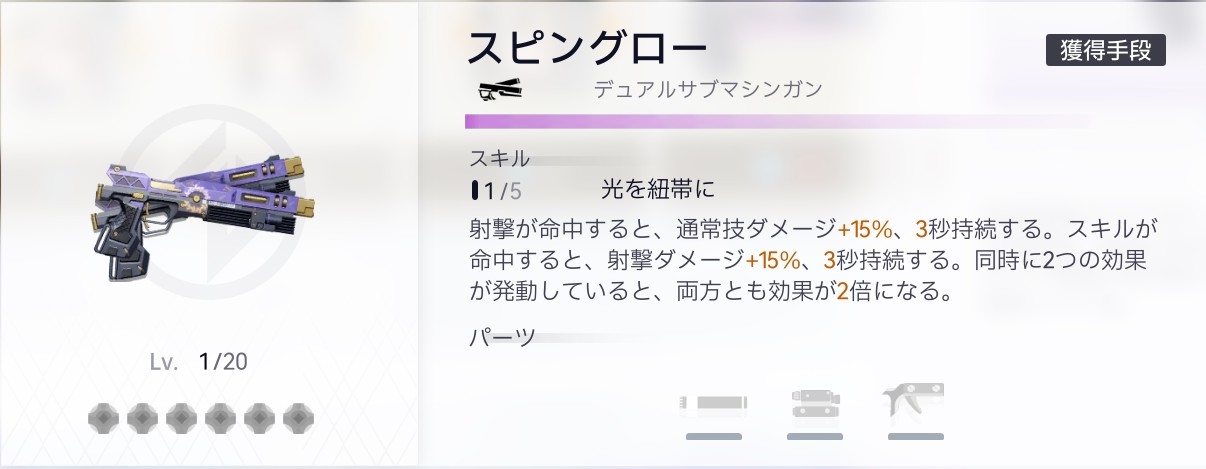 射撃が命中すると、通常技ダメージ+25%、3秒持続する。スキルが命中すると、射撃ダメージ+25%、3秒持続する。同時に2つの効果が発動していると、両方とも効果が2倍になる