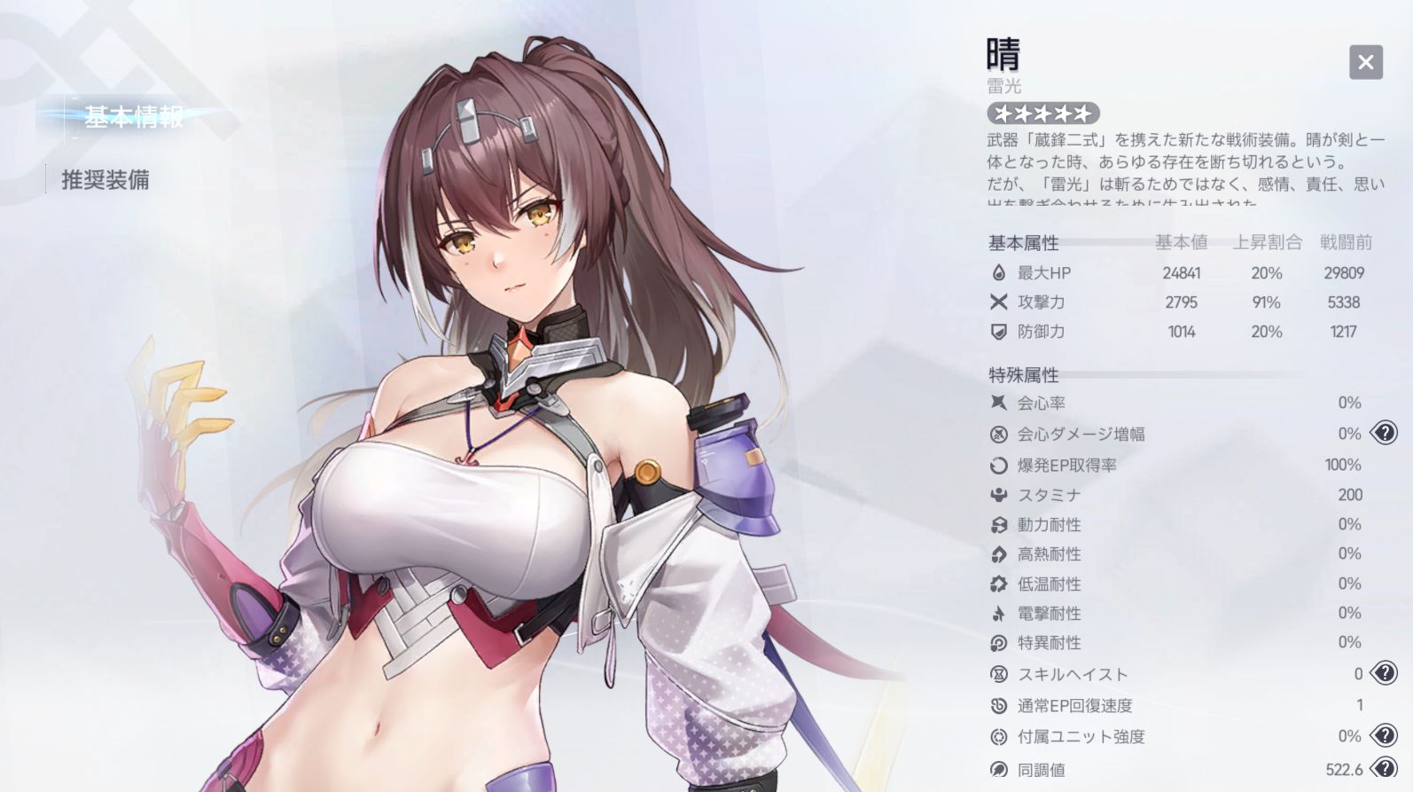| 攻撃力 | 同調値100につき、晴の攻撃力が追加で+5% |