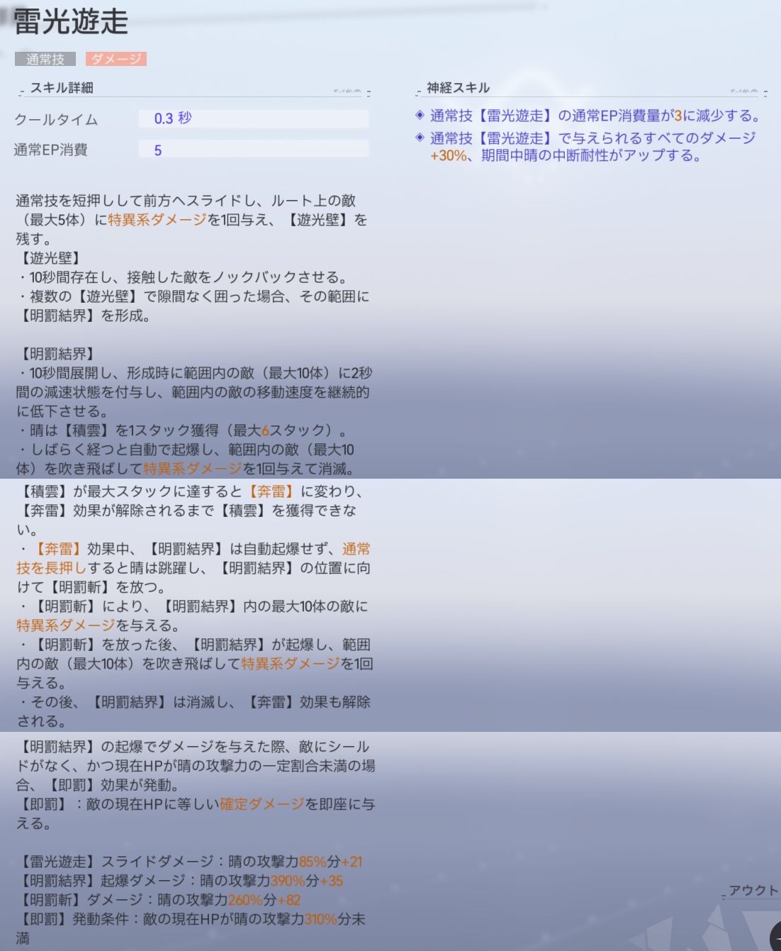 【明罰結界】形成時、「晴-雷光」は【晴雷】効果を獲得:攻撃力+50%、スキルが敵に命中すると、その敵が「晴-雷光」から受けるスキルダメージ+20%(【晴雷】は【明罰結界】消滅時に解除)