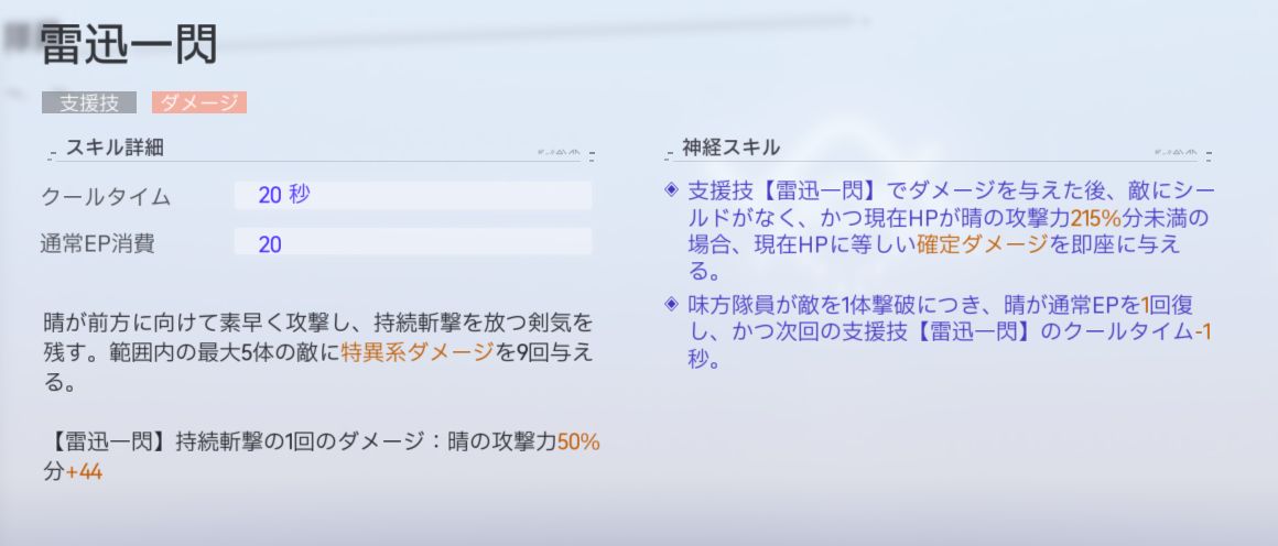 味方隊員が敵を撃破するごとに晴の通常EPが回復し、支援技のクールタイムが減少していきます。晴を使うときは晴がメインを張ると思うので、使う機会はそう多くはなさそう。