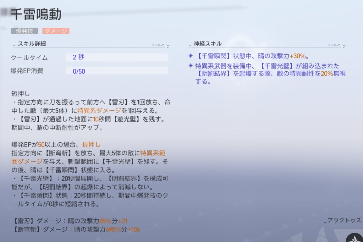 | ダメージ | 【雷刃】ダメージ:晴の攻撃力85%+21 【断穹斬】ダメージ:晴の攻撃力690%+106 |