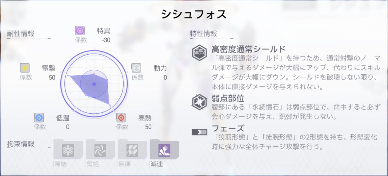 スキルダメージが大きく軽減される代わりに、ノーマル弾による射撃ダメージが増加します。シールドが無くなった後はスキルダメージも通るようになります。