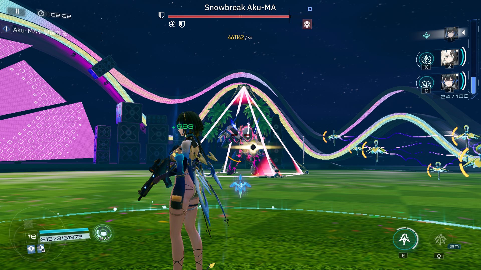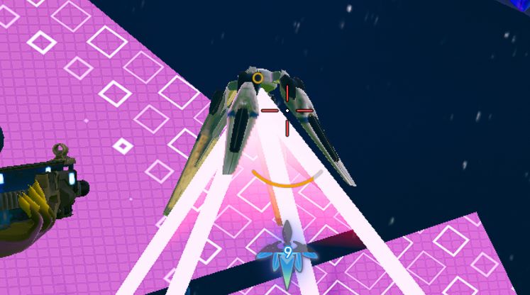 見た目はド派手ですが正面にしか飛んできません。盛り上げ演出の意味合いが大きいのかもしれない。この時もバリアを展開しているせいでボスのHPが回復していきます。はよ降りてきなさい。