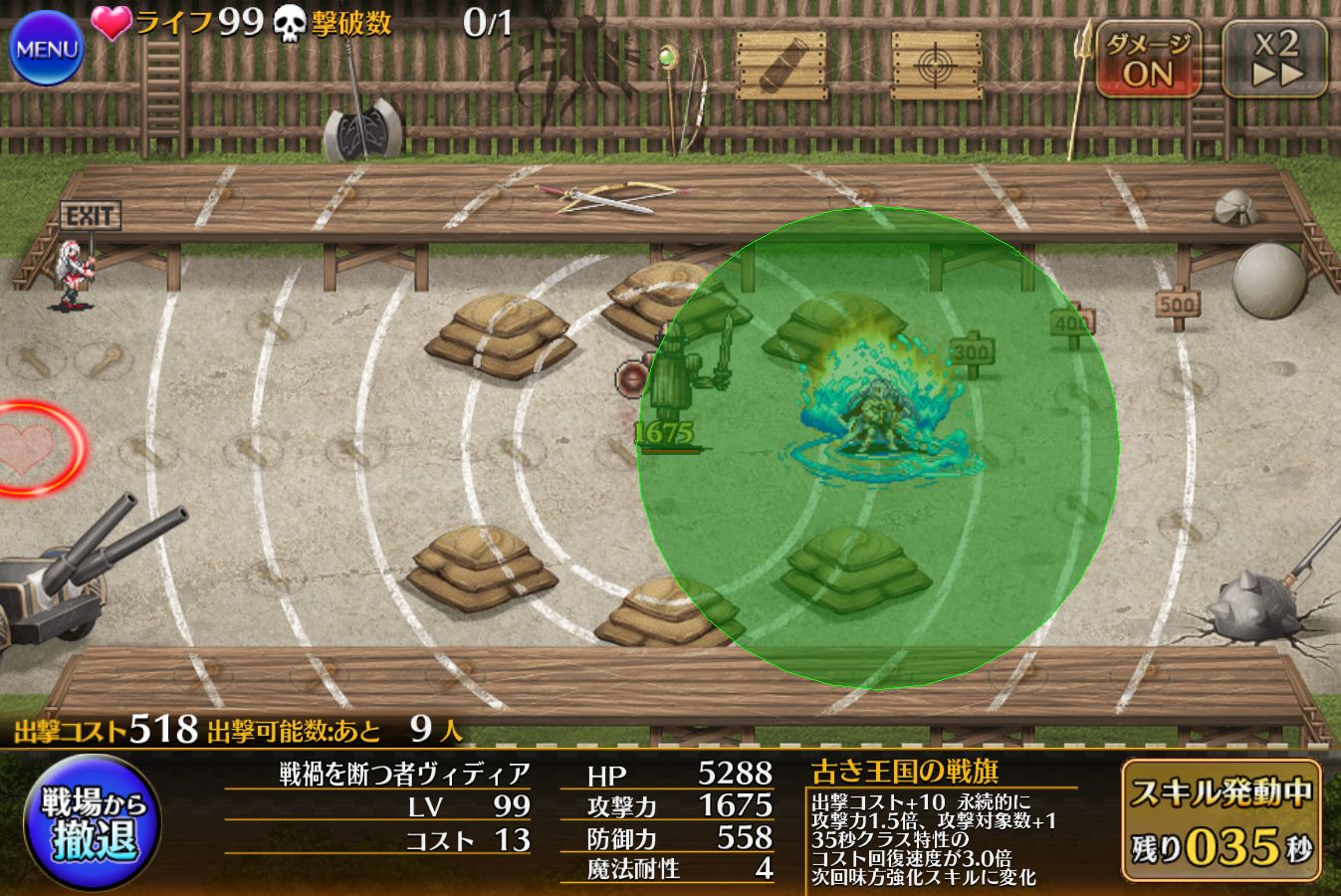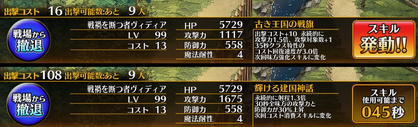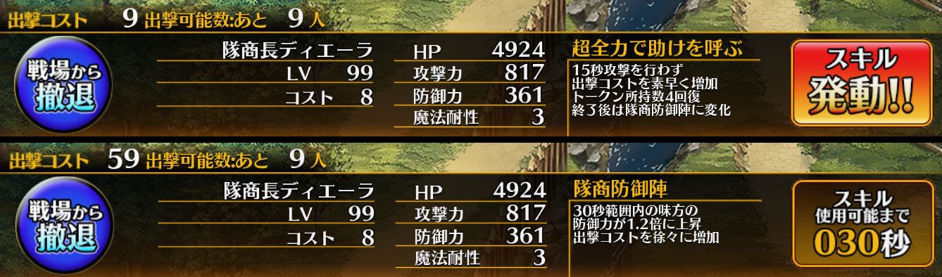 | 効果 | 出撃コスト+10 クラス特性のコスト回復速度3.0倍 次回味方強化スキルに変化 |