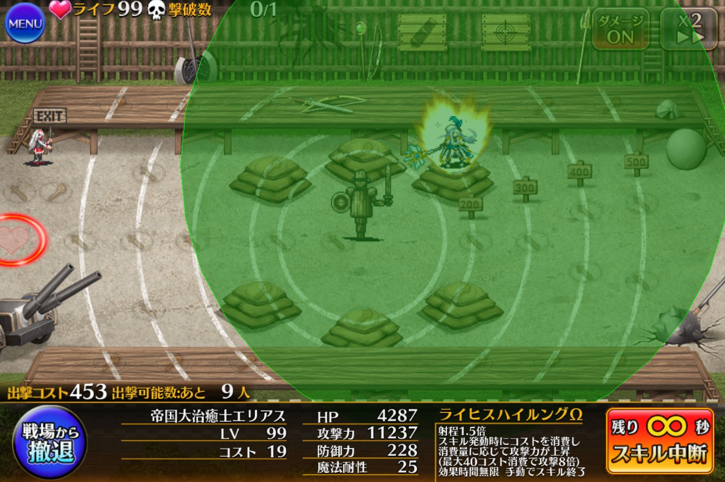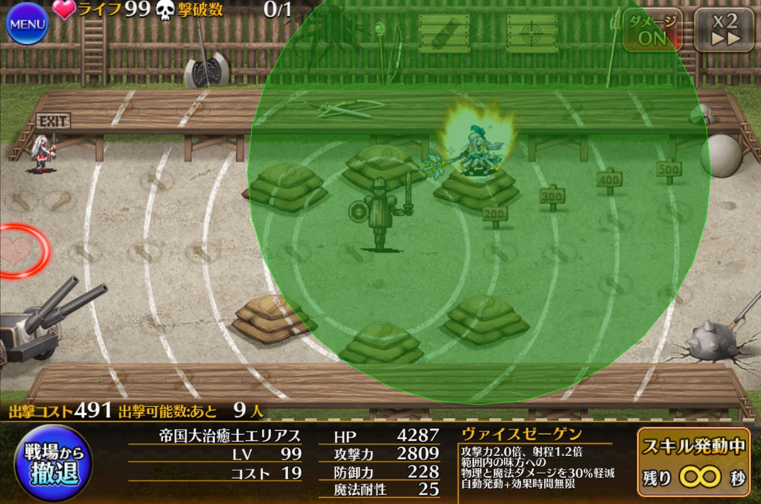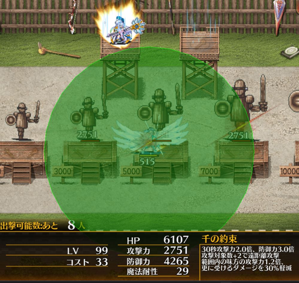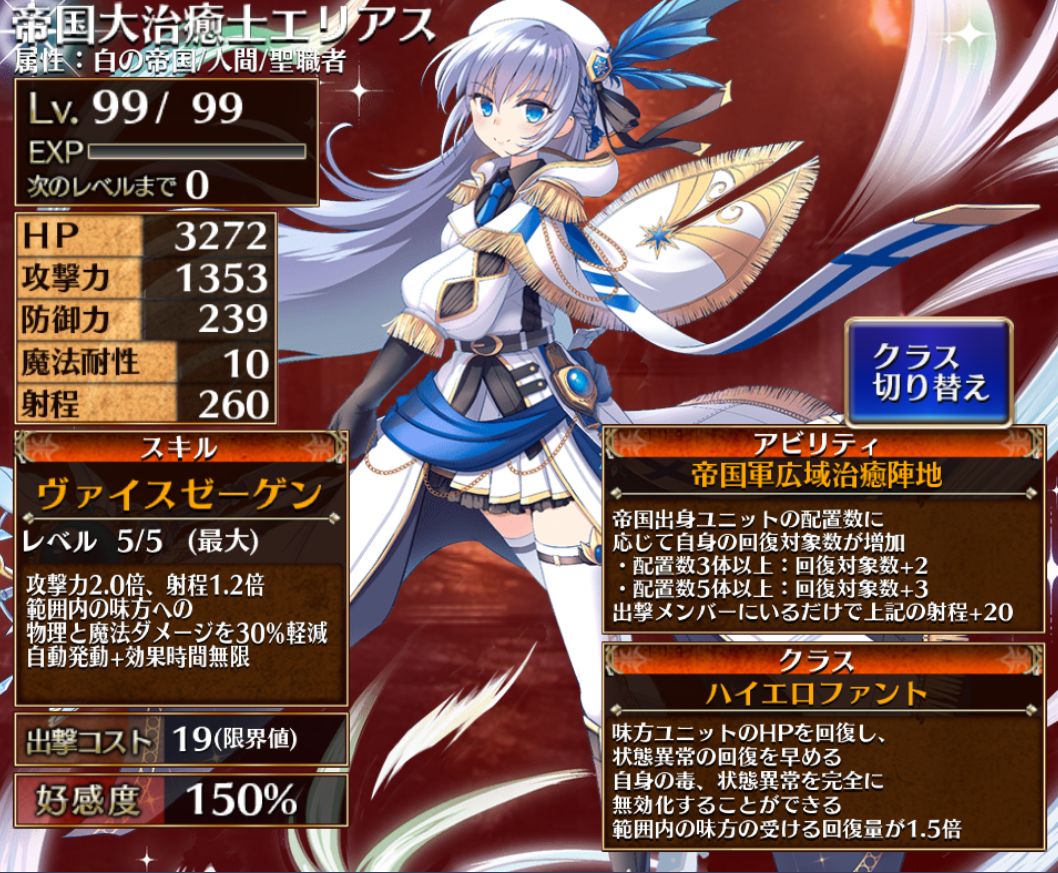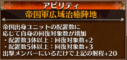 この範囲内の味方に永続でマルチヒールとダメージ軽減30%を付与できるのが偉ーい!ちゃんと攻撃倍率が付いているおかげで回復量も文句なし。ただ、帝国ユニットを複数展開しないと単体ヒールになるってところがネック。